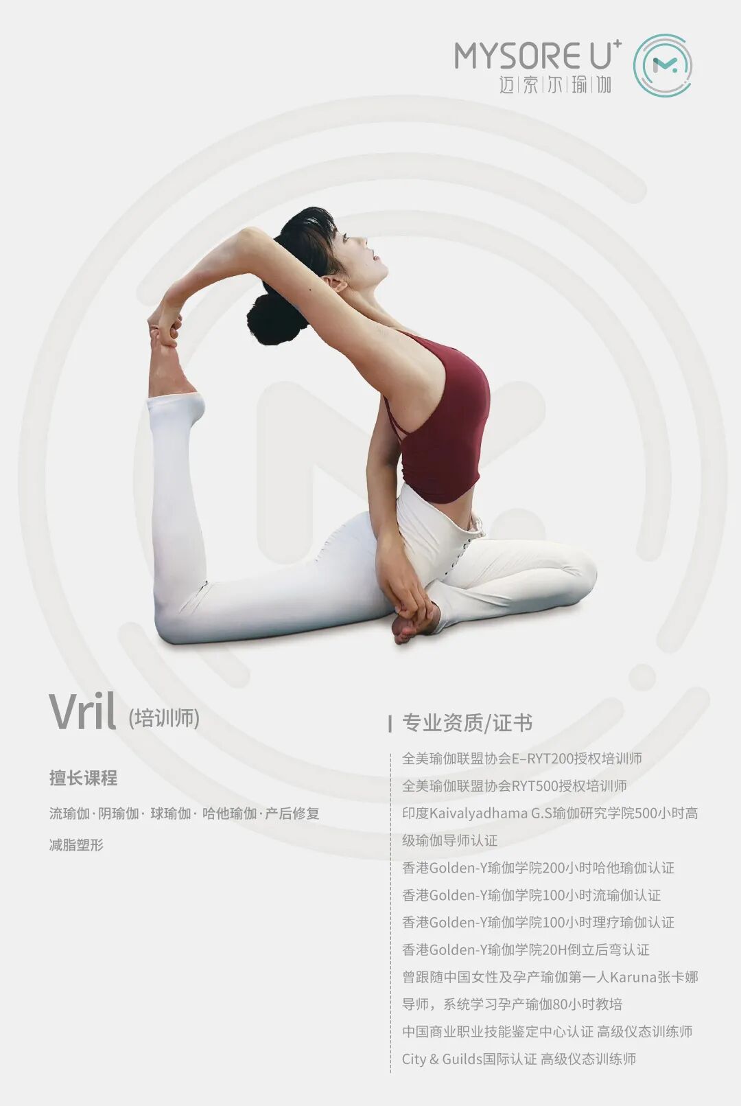 很多很多美好的感觉 哀、乐、喜、悲 都在阴的练习里慢慢去体会 阴瑜伽的练习,恰好以中国经络理论为基础,结合特定的瑜伽体式来刺激体内「气」的流动,以活络身体能量。 MysoreU+YOGA 每天只需十几分钟的时间 让你跟自己的身体,心灵单独相处的私人空间 体式的练习 不仅可以促进血液循环 伸展僵硬肌肉 还能达到按摩身体内部器官的效果哦 长期练习下来,就会成为慢性疾病绝缘体 阴 瑜 伽 YOGA 中文名:胡薇 英文名:Vril 擅长课程: 哈他瑜伽、阴瑜伽、流瑜伽、球瑜伽、产后修复、减脂塑形 培训经历: 中国商业职业技能鉴定中心认证 高级仪态训练师 City & Guilds国际认证 高级仪态训练师 中国商业职业技能鉴定中心认证“高级仪态训练师” 英国City&Guilds国际认证“高级仪态训练师” 2016-2017年度上海戏剧学院 新媒体艺人“形体培训师” 全美瑜伽联盟E-RYT200授权培训师 全美瑜伽联盟RYT500认证老师 印度Kaivalyadhama G.S.瑜伽研究学院500小时认证“高级瑜伽老师” 曾跟随中国悠季瑜伽学院院长默翰导师,系统学习200小时瑜伽理疗课程培训 曾跟随王昕、王媚、张卡娜等多名国内知名孕产瑜伽导师,系统学习孕产瑜伽教培(且拥有超过2500节孕产私教实践经验) 【瑜伽故事】 Vril老师来自水软风清的江南水乡,从小修形体长大,大学的时候开始接触瑜伽,并被瑜伽“柔软的力量”深深吸引,在短时间经历过政府、金融行业之后,决定追随内心,成为一名全职瑜伽老师。为了精进专业,她走遍了北上广深的瑜伽圈,师从国内多位顶级瑜伽导师,学习经历与教学经验都非常丰富,并形成出了独特的上课风格。她非常专注于体式的精准正位,声音轻柔动听,口令清晰明了,能带领所有人静下来心来享受当下练习的每分每秒,拥有极强的疗愈系能量场。 一边旅游,一边瑜伽,边走边学 在海拔最高殿宇嵯峨的布达拉宫、全世界瑜伽爱好者必打卡的普吉岛、或是诗情画意美得像仙境一样的大理洱海等等名景,都留下过她的足迹。她期待每一个可以“慢下来”的瞬间,享受清晨、微风、美景,和一个人在垫上的瑜伽。 如今,Vril选择回到自己熟悉的城市, 拥有丰富阅历及内心原动力的她,更能专注当下。 这些经历也助她成为一名优秀的瑜伽老师。 。 。 。 课程大纲 阴瑜伽 阴瑜伽的理论基础 阴瑜伽练习基础 阴瑜伽的体式练习 阴瑜伽的教学 一 阴瑜伽的理论基础 1、阴与阳 2、阴组织与阳组织 3、阴瑜伽的历史 4、阴瑜伽与关节 5、阴瑜伽与中医经络走向 6.阴瑜伽与中医的穴位点 二 阴瑜伽练习基础 1、如何练习阴瑜伽 2、什么时候练习阴瑜伽 3、练习之前的注意事项 4、阴瑜伽的练习原则 三 阴瑜伽的体式练习 1、阴瑜伽所有体式的讲解及辅具的运用 2、每个体式需要学习: a、益处 b、不适特征 c、其他选择 d、经络&器官影响 e、关节的影响 f、保持多长时间 四 阴瑜伽的教学 1、初学者阴瑜伽课程 2、阴瑜伽中医经络养生专题课程 3、二十四节气经络养生课程 上课剪影 静下心来, 享受最真实的自己